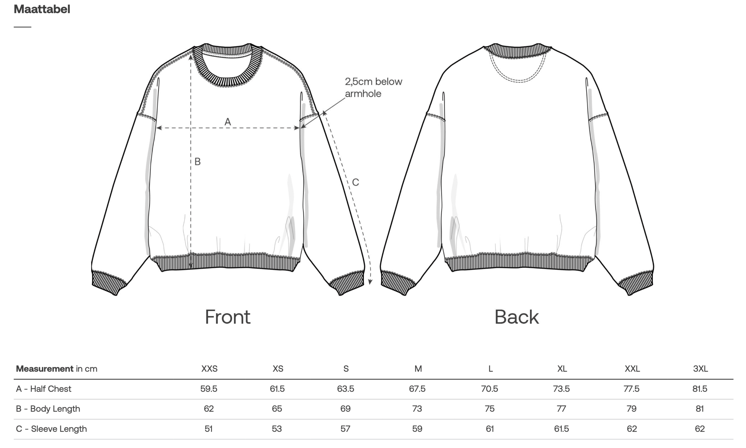 Neem je favoriete trui en vergelijk goed met de maattabel om zeker te zijn van de juiste maat, want deze shirts hebben een oversized fit.